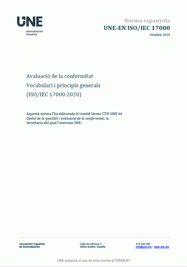 Avaluació de la conformitat: Vocabulari i principis generals UNE-EN ISO/IEC 17000:2020 Asociación Española de Normalización
